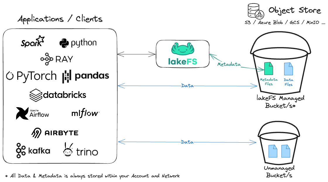 lakeFS is an open source project that supports managing data in AWS S3, Azure Blob Storage, Google Cloud Storage (GCS), S3-Compatible storage solutions and even locally mounted directories. It integrates seamlessly with popular data frameworks such as Spark, AWS SageMaker, Pandas, Tensorflow, Polars, HuggingFace Datasets and many more.